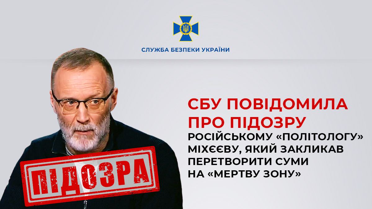 Служба безпеки України повідомила про підозру російському пропагандисту Сергію Міхєєву. Фігурант, який позиціонує себе як політолог, в одному з ефірів пропагандитських каналів РФ закликав здійснити серію масованих ракетно-артилерійських та авіаційних ударів по Сумах.