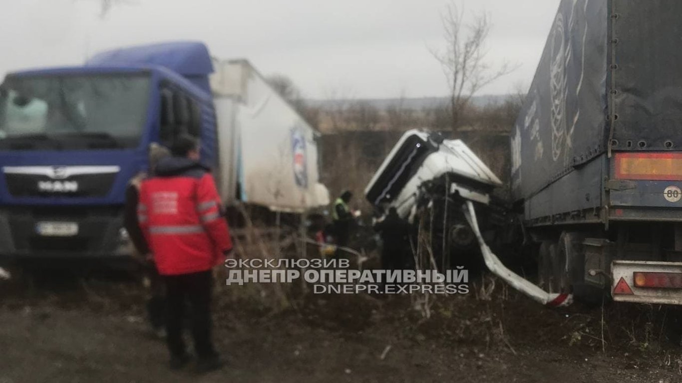 У Дніпропетровській області на трасі М-30 сталася ДТП. У вантажного автомобіля Renault на швидкості лопнуло колесо, через що він виїхав на зустрічну смугу та зіштовхнувся з припаркованою автівкою MAN.