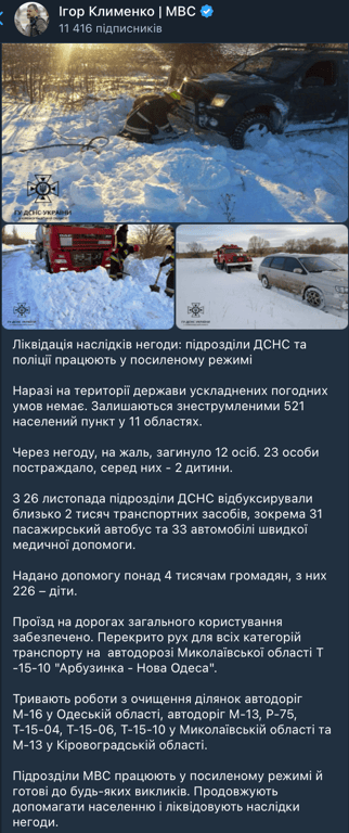 Игорь Клименко отметил о гибели 12 человек в результате снежного нашествия на Украину. Кроме того, пострадали 23 человека, среди них — два ребенка. Без электроэнергии остается 521 населенный пункт в 11 областях. Спасатели работают в усиленном режиме, чтобы устранить последствия непогоды.