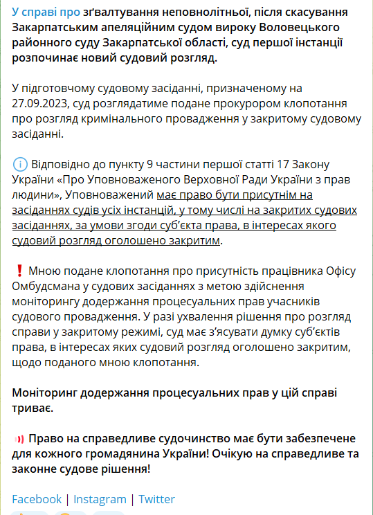 "Мною подано ходатайство о присутствии работника Офиса Омбудсмана в судебных заседаниях с целью мониторинга соблюдения процессуальных прав участников судебного производства. В случае принятия решения о рассмотрении дела в закрытом режиме, суд должен выяснить мнение субъектов права, в интересах которых судебное разбирательство объявлено закрытым, по поданному мною ходатайству", — отметил Лубинец.