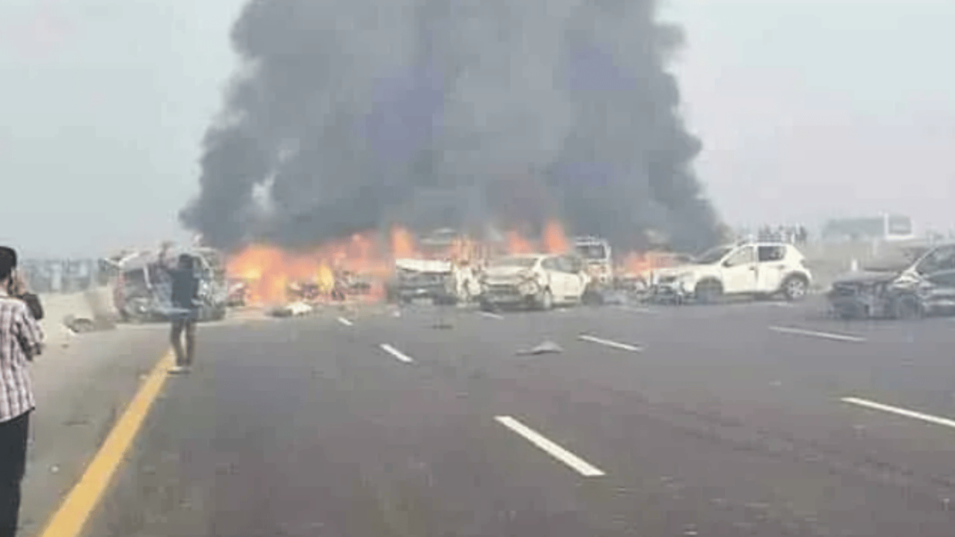 Множество автомобилей столкнулись на пустынной дороге перед въездом в деревню Аль-Шуджаа. Первое столкновение произошло между пассажирским автобусом и несколькими легковыми автомобилями. В результате столкновения произошла утечка масла, что привело к столкновению большего количества транспортных средств.