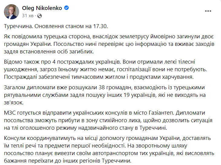 "Как сообщила турецкая сторона, в результате землетрясения, вероятно, погибли два гражданина Украины. Посольство сейчас проверяет эту информацию и принимает меры по установлению лиц погибших", — написал Николенко.