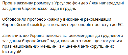 "Заверил, что Украина выполнит все рекомендации к декабрьскому заседанию Европейского совета, включая касающиеся прав национальных меньшинств и укрепления антикоррупционных институций", — сказал президент.