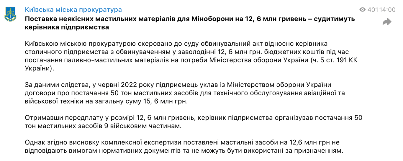 "Однак, згідно з висновком комплексної експертизи, поставлені мастильні засоби на 12,6 млн грн не відповідають вимогам нормативних документів та не можуть бути використані за призначенням", — йдеться в повідомленні.