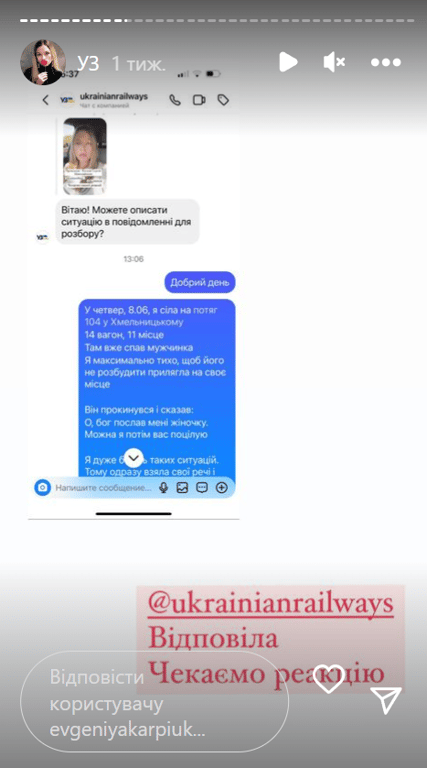 Пасажирка Укрзалізниці , яка їхала потягом Львів—Київ, поскаржилася на домагання з боку чоловіка, і на прохання пересадити її в інше купе провідник відмовив їй. Наразі в організації проводять службову перевірку інциденту і в разі чого застосують до працівника дисциплінарні заходи.